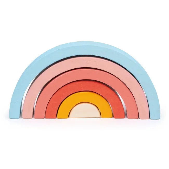 This arched stacking rainbow and sunset tunnel toy is made from 6 pieces, each one colored to resemble the evening sky. Read more.
